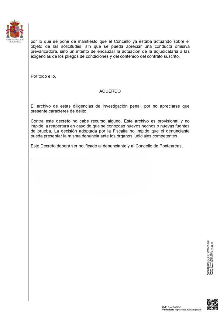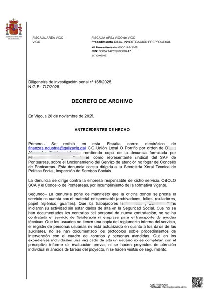 Ponteareas, 26 de novembro de 2025. A Fiscalía de Área de Vigo vén de comunicar a súa resolución sobre a denuncia presentada pola CIG o pasado 24 de outubro en relación co Servizo de Axuda no Fogar (SAF). O órgano fiscal decreta o arquivo das dilixencias, ao non atopar nin un só indicio de delito, nin sequera posibilidade de recurso. Un pronunciamento categórico que confirma que o Goberno actuou con plena corrección e dentro da legalidade.