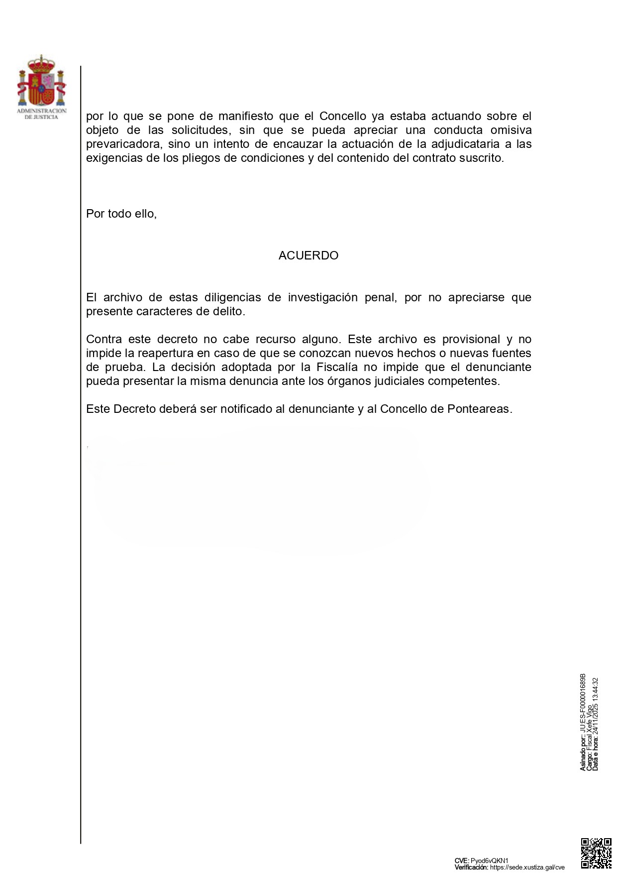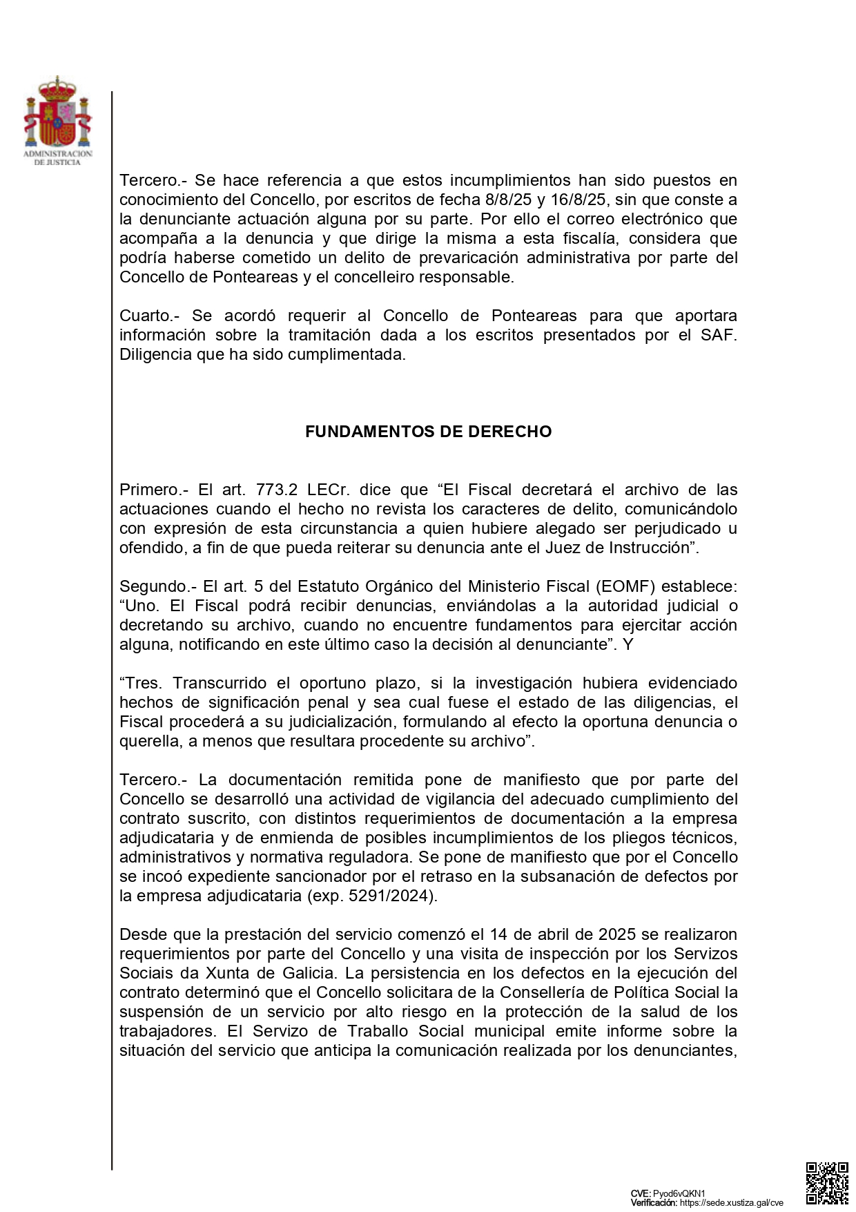 Ponteareas, 26 de novembro de 2025. A Fiscalía de Área de Vigo vén de comunicar a súa resolución sobre a denuncia presentada pola CIG o pasado 24 de outubro en relación co Servizo de Axuda no Fogar (SAF). O órgano fiscal decreta o arquivo das dilixencias, ao non atopar nin un só indicio de delito, nin sequera posibilidade de recurso. Un pronunciamento categórico que confirma que o Goberno actuou con plena corrección e dentro da legalidade.
